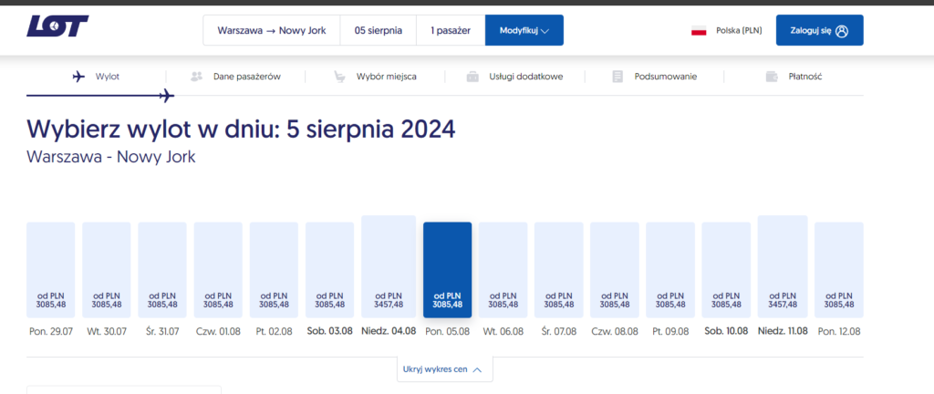 Najlepszym wyborem będzie zdecydowanie Warszawa ze względu na bezpośrednie połączenie z Nowym Jorkiem. Samoloty z Lotniska Chopina odlatują codziennie w godzinach popołudniowych, a sam lot trwa niewiele ponad 9 godzin. Bezpośrednią trasę do Nowego Jorku obsługują Polskie Linie Lotnicze. Koszt biletu to ok 3000 zł.