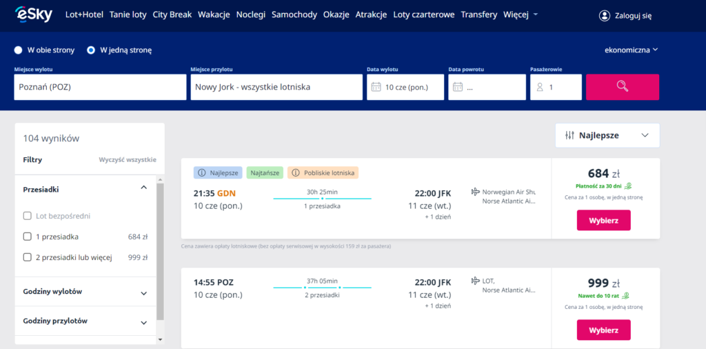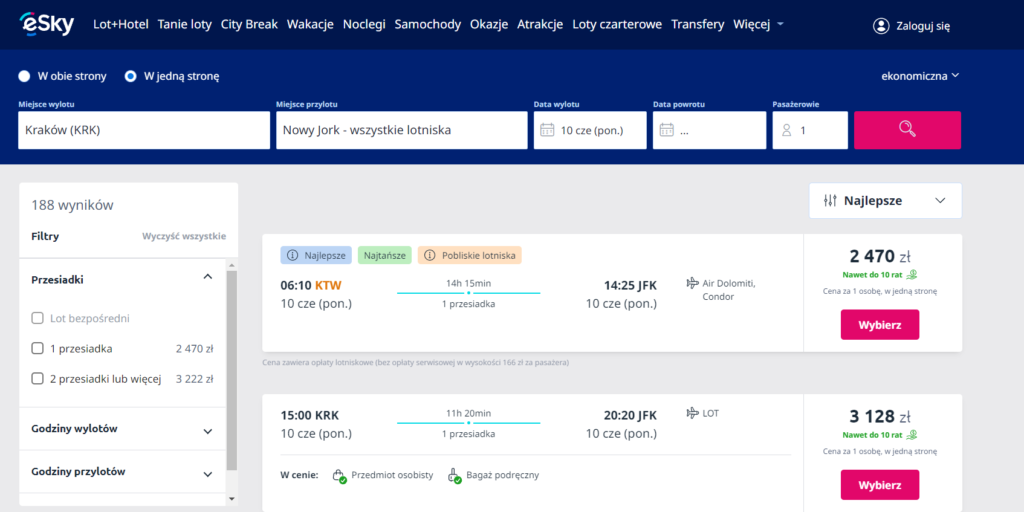 Do Nowego Jorku można dolecieć praktycznie z każdego lotniska w Polsce, jednak tylko Lotnisko Chopina w Warszawie umożliwia lot bezpośredni. Wyruszając z innego portu lotniczego będziemy musieli liczyć się z co najmniej jedną przesiadką.
